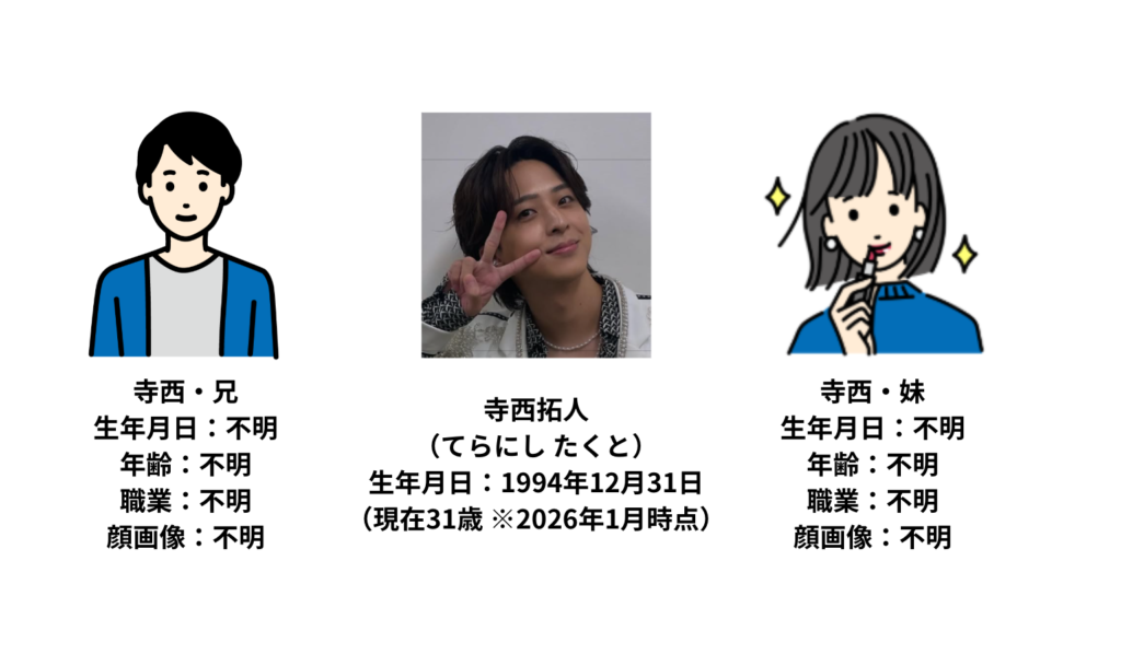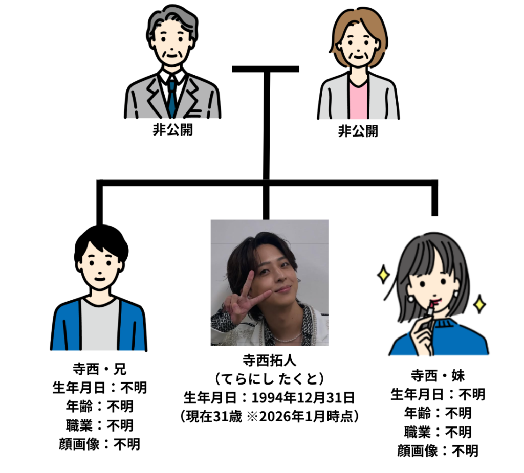 寺西拓人さんの兄は、3人きょうだいの長男にあたる存在です。ただし、兄も一般人のため、名前や年齢、職業などの詳しい情報は一切公表されていません。メディアへの登場歴もなく、プライベートはしっかり守られているようです。