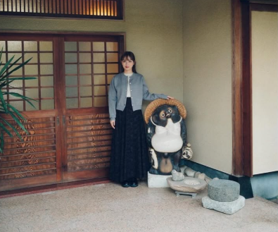 写真には、玄関前に置かれた信楽焼のたぬきの置物や、